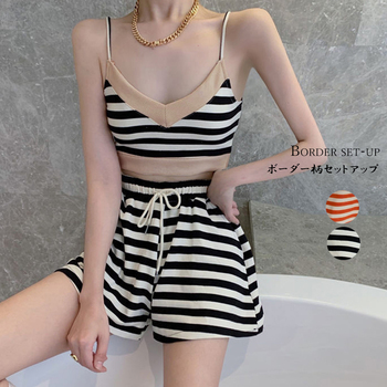可愛いボーダー柄キャミソールとショートパンツのセットアップ
