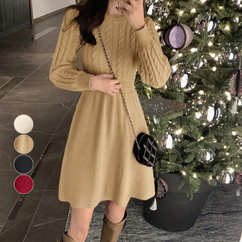 ウエストマーク Aラインワンピース 通勤通学 フレアワンピース シンプル ハイウエスト 長袖 膝上丈ワンピース 秋冬無地きれいめワンピース 体型カバー ニット 10代20代30代