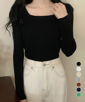 スクエアネック リブニットトップス 秋冬