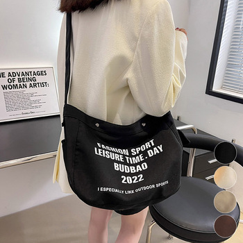 フロントの英字ロゴは目を引くお洒落な風キャンバスショルダーバッグ
