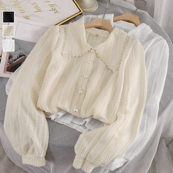 大きな襟とあしらったフェイクパールがポイントになったブラウス