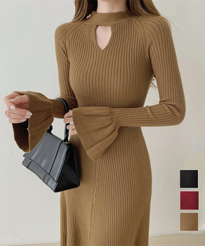 キーホールネックリブニットワンピース秋冬