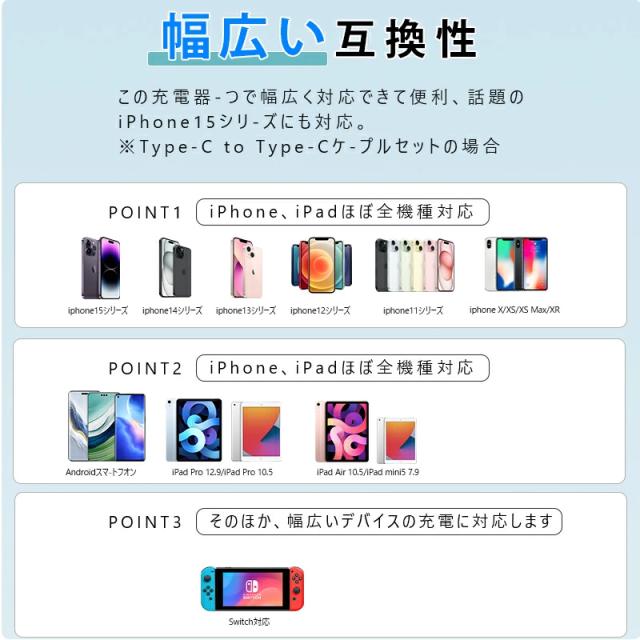 usb c充電器は、ノートパソコン(MacBook Pro 16、15、14、13インチ、MacBook Air、Dell XPS 15/13、HP Spectre/HP Chromebook) タブレッド、iPad 、iPhone( iPhone16 Pro/14 Pro Max/13/12)Android(Galaxy S23 Ultra/S22)、ブルートゥースイヤホン、ゲーム機、など多機種に対応。