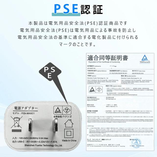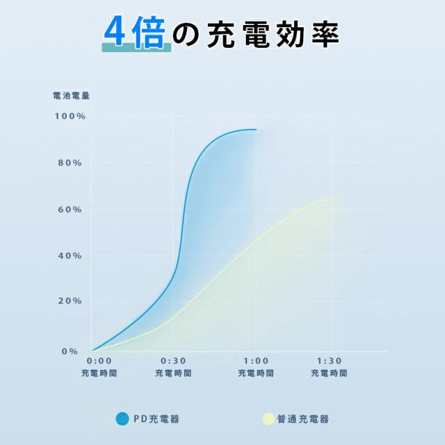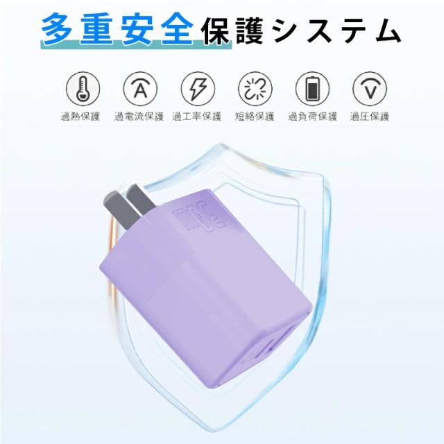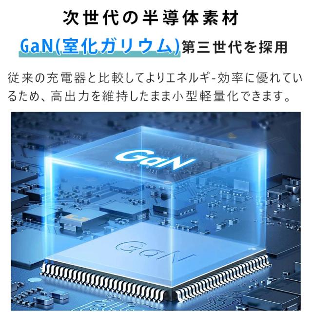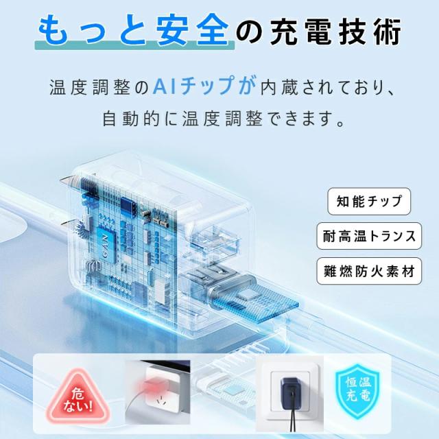 従来のシリコン半導体と比べ、充電効率が高く高出力でも発熱を抑えられ。厳格な電気用品安全法(PSE)に認証されており、安全性と高速性を保証します。また、cタイプ 充電器は「GaN」窒化ガリウムICを採用して、軽量化、高效率、過熱、過充電、安定性安全性向上、多機能性などの利点やメリットが揃います。長時間使えるでもあんしんを感じられる。