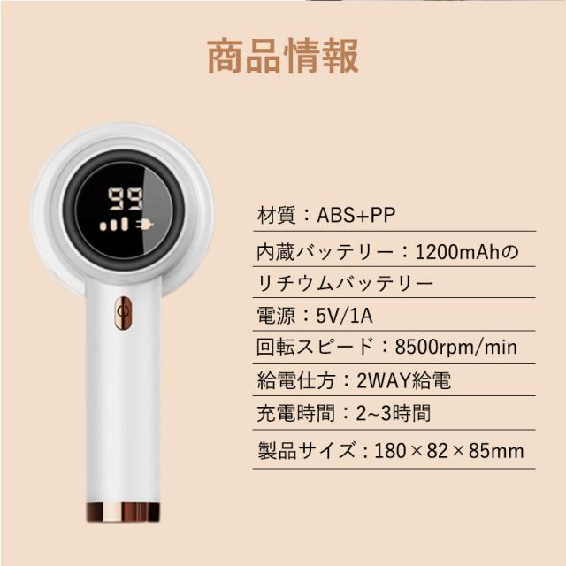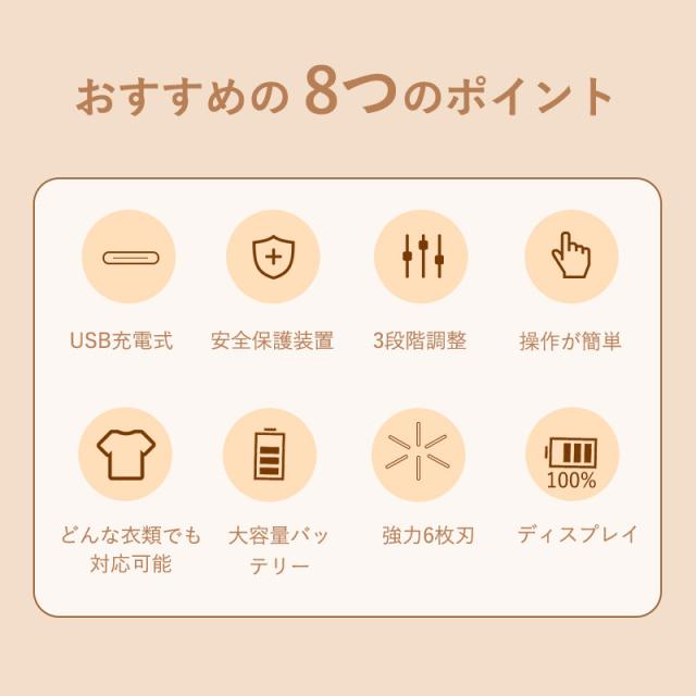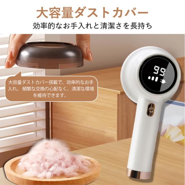 | Q: この毛玉取り器はどのような衣類に使えますか? A: セーター、コート、カーディガン、ソファ、毛布など、あらゆる布製品に対応可能です。大小異なる毛玉をしっかり除去し、衣類の美しさを蘇らせます。 Q: 操作は簡単ですか?初心者でも使えますか? A: はい、とても簡単です!ワンタッチで3段階(ロー・ミディアム・ハイ)の調節が可能で、LCDディスプレイで動作状況が一目で確認できます。初心者の方でも直感的に操作できます。 Q: バッテリーの持ちはどのくらいですか? A: 内蔵された1200mAhの大容量バッテリーにより、フル充電で最大約2~3時間連続使用が可能です。さらに、充電しながらの使用にも対応しているため、長時間の毛玉取り作業も安心です。 Q: 衣類が傷つく心配はありませんか? A: 安全設計されたハニカムカバーを採用しており、大小異なる穴が衣類を優しく保護します。衣類を傷つけることなく、毛玉をしっかり除去できます。 Q: 持ち運びや収納は便利ですか? A: 本体は軽量コンパクト設計(わずか約300g)で、収納や持ち運びに便利です。自宅はもちろん、出張や旅行先でも簡単に使用できます。 Q: 安全機能はありますか? A: 外刃を外すと自動で電源がオフになる安全スイッチを搭載しており、お子様のいる家庭でも安心してお使いいただけます。 | ||||||