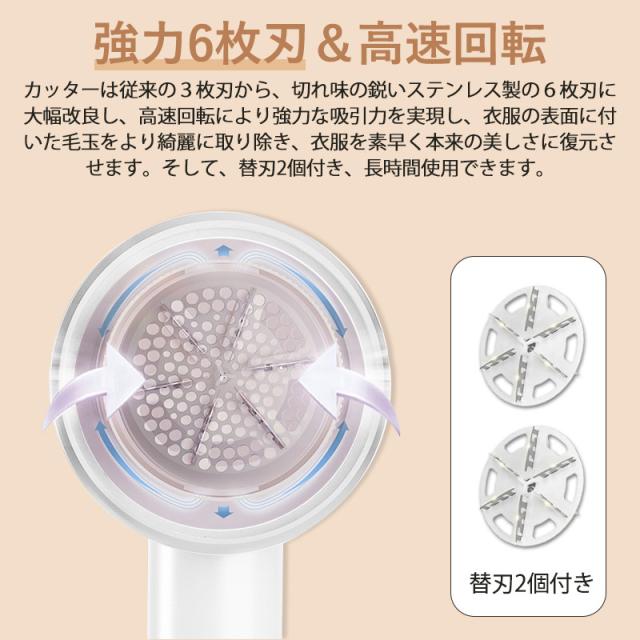 カッターは従来の3枚刃から、切れ味の鋭いステンレス製の6枚刃に大幅改良し、高速回転により強力な吸引力を実現し、衣服の表面に付いた毛玉をより綺麗に取り除き、衣服を素早く本来の美しさに復元させます。 そして、替刃2個付き、長時間使用できます。