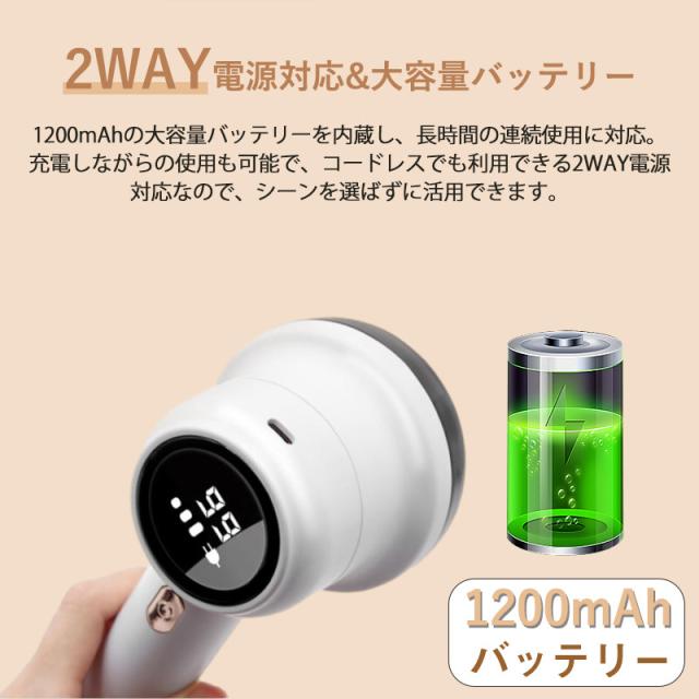 1200mAhの大容量バッテリーを内蔵し、長時間の連続使用に対応。充電しながらの使用も可能で、コードレスでも利用できる2WAY電源対応なので、シーンを選ばずに活用できます。