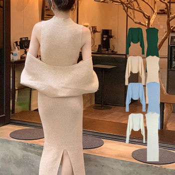 フェミニン 秋冬ロングワンピース ボレロカーディガン セットアップ きれいめ 無地タイトワンピース バックスリットニットアンサンブル セクシーワンピ上品 大人ワンピ 着やせ