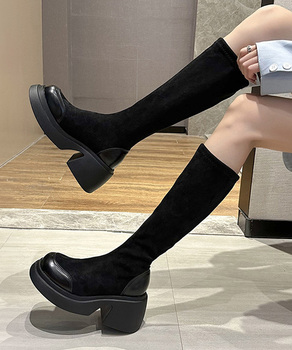 異素材をミックスして個性溢れるデザインの厚底ロングブーツ。