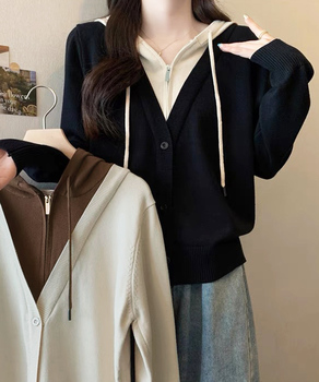 ニットトップス フード付き カジュアル 配色ニット レディース ニットソー バイカラー プルオーバー レイヤード風ニットウエア 秋冬 セーター 可愛い