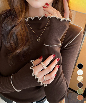 レディース おしゃれ 長袖カットソー プチハイネック 暖か 着やせ 秋冬 ストレッチTシャツ フリル衿 インナートップス柔らかい あったか 防寒インナー 無地 バイカラートップス