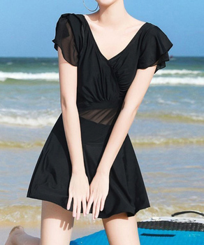 Vネック オールインワン水着 フリル袖 スイムウェア 透かし セクシーママ水着 ショートパンツ一体型 大人可愛い 無地みずぎ 黒 夏海 フェミニンビーチ 背中魅せワンピ水着