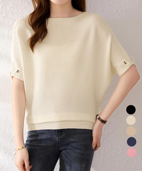 レディース ボートネック ニットトップス 着やせニットTシャツ 大人カジュアル サマーセーター 風ニットプルオーバーゆったり トップス 体型カバー ニット 無地半袖トップス