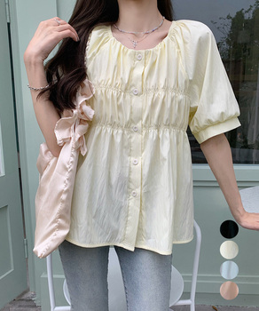 女性らしさが際立つフェミニンなシャーリング半袖ブラウス