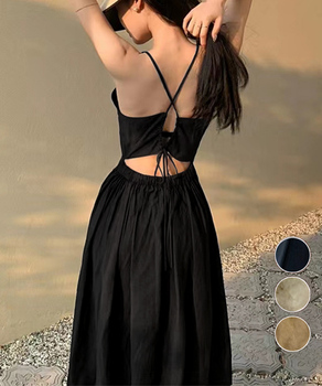 胸元のシャーリングアクセントでさりげないニュアンスチェンジが楽しめ、バックスタイルのリボン結びと肌見せがセンシュアルな印象に