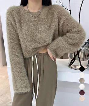 ショート丈ニットトップス 秋冬 ふわふわモヘアトップス 長袖ニットソー オシャレプルオーバー クルーネックニットセーターゆるニット柔らかい 大人可愛いトップス シンプルニット無地