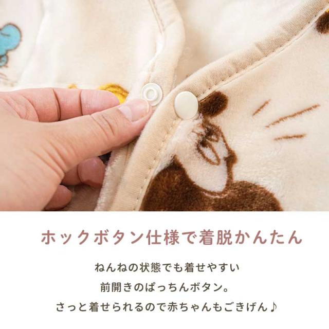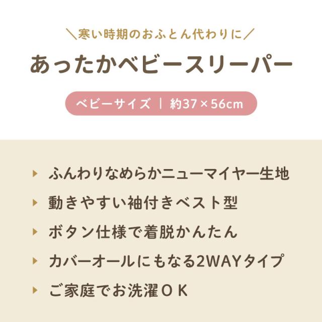 | ・ふんわりなめらかニューマイヤー ふわふわで気持ちいいニューマイヤー生地。やさしいタッチに包まれて、お子様もほっこり安心してお休みいただけます。 ・動きやすい袖付きベスト型フレンチ型の袖付きベスト。肩口まであたたかく、動きやすいのがうれしいポイントです。 ・ホックボタン仕様で着脱かんたんねんねの状態でも着せやすい前開きのぱっちんボタン。さっと着せられるので赤ちゃんもごきげん♪ ・ボタンを留めるとカバーオールに!2WAY仕様股下のボタンを止めるとカバーオール型としても使えます。寝ていてもめくれ上がったり、はだけないのがポイント! ・おうちで洗えて乾きやすいご家庭の洗濯機でお洗濯OK!ポリエステル素材なのでお洗濯をしても乾きやすく、忙しいママやパパにもうれしい♪ | |