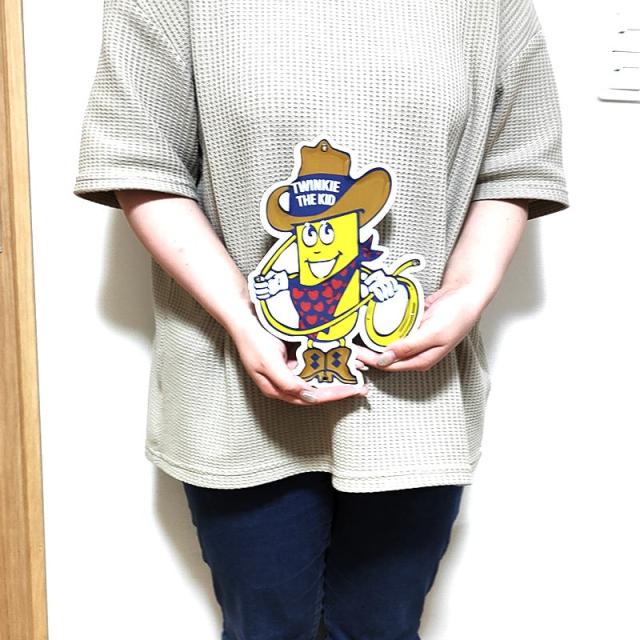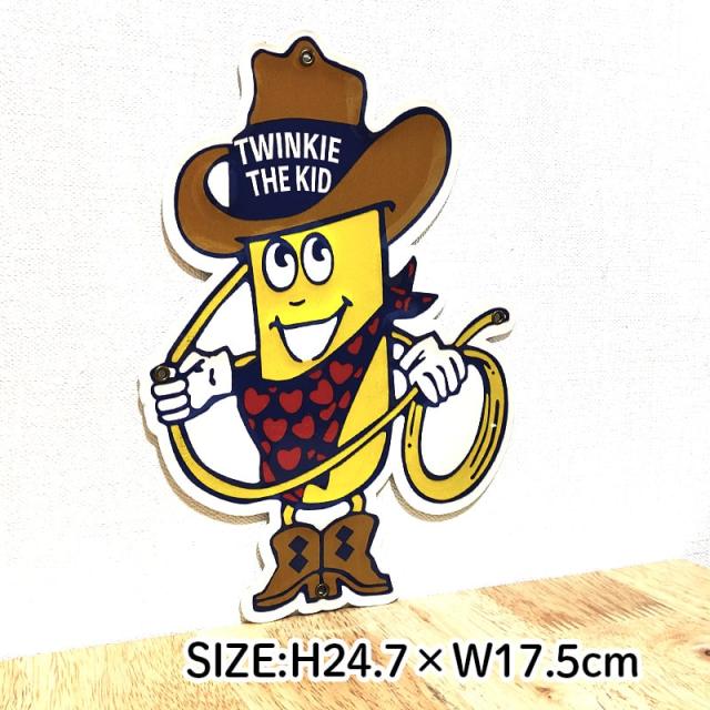 アメリカのお菓子メーカー・Hostessのマスコットキャラクター「Twinkie the Kid」の形をした可愛いブリキ看板です。