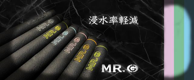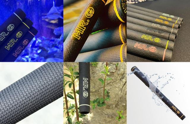 MR.Gグリップは、エラストマー素材とは思えないような質感と新素材を配合し撥水効果を生み出しました。また表面と裏面でエンボス模様が異なっており、それぞれに異なった質感となっており、グリップ力が増す模様となっております。MR.Gグリップは、ゴルフクラブと自身の身体を唯一繋ぐ物であり最も大事な物である。特に気候が左右するゴルフではグリップ力や、他の要素は必須であり、グリップにあたる中指、薬指側 に凸の形状を施し、また、あまり力を入れたくない親指側の形状も変化させている。さらにグリップの素材自体に撥水素材を混ぜ、余分な水分除去を担っていることで、雨の日のゴルフや、手汗など余分な水分をグリップ内に吸収せず、簡単な拭き取りで除去できる。