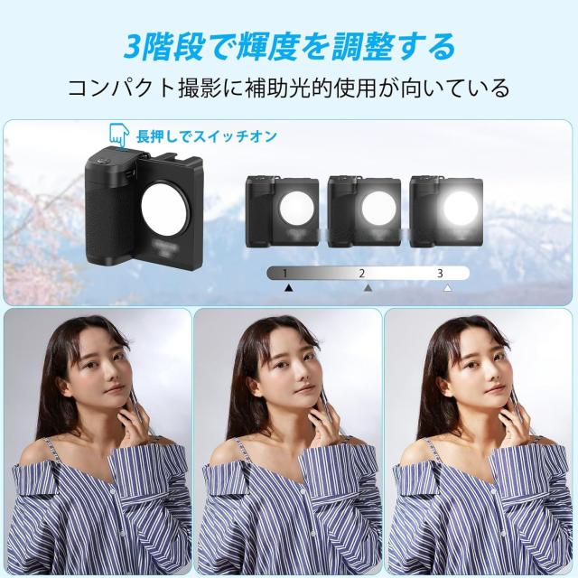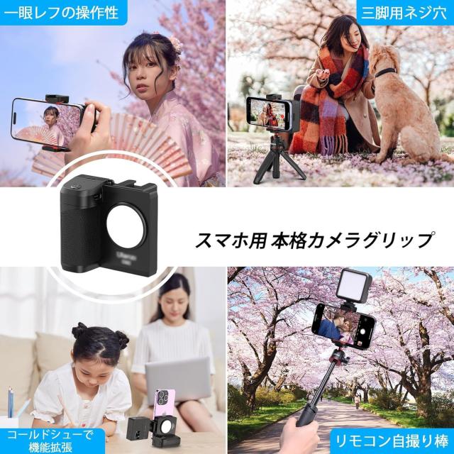 スマホグリップ スマートフォンホルダー 撮影用ライト付き 三脚用 Bluetoothリモコン付き 取付可能 人間工学設計 旅行 写真 動画を撮る 1/4ネジ コールドシュー付き 三脚 一脚 自撮り棒 iPhone Androidに対応 日本語取扱書付き