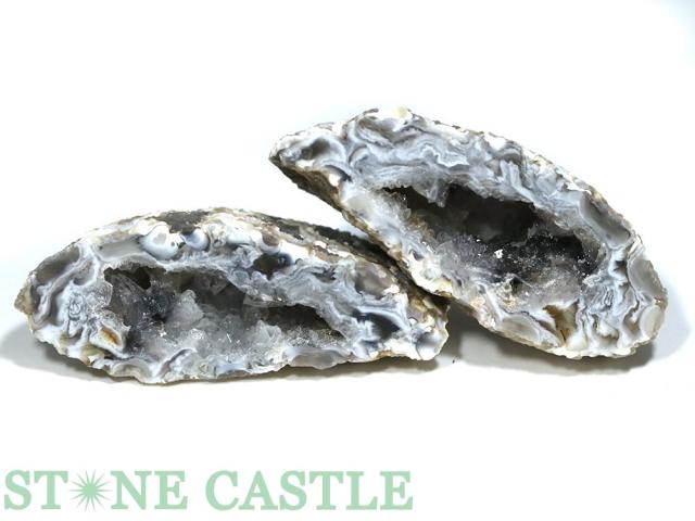 小さめサイズのメノウのノジュール(塊)を二つ割りにしたものです。可愛らしいサイズですが晶洞に水晶が発達している様子や、メノウの縞が美しく発達して いる様子などが楽しめる原石です。風水的にメノウの晶洞には神龍が休みに来ると言われます。龍は幸いを運んでくるとされ、手のひらサイズの開運アイテムとしても人気です。