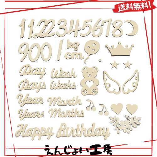 【セット内容】合計40枚セット、0*2枚、1*2枚、2*2枚、3~9各1枚、王冠*1枚、星*2枚、羽*2枚、ハート*2枚、花*1枚、熊*1枚、風船*1枚、点*1枚、斜線*1枚、サクランボ*2枚、kg、cm、happy、birthday、day、days、week、weeks、month、months、year、years各一枚、合計40枚、サイズ:写真欄にご参照ください。素材:ウッド、厚さ:約3.6mm