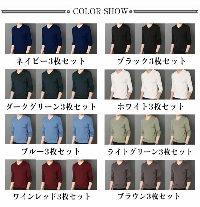 | vネック長袖Tシャツ 3枚セット S〜5XL スッキリとしたタイトシルエットのvネックTシャツ。 程よい深さのvネックなのでスッキリとした印象に仕上げてくれます。 一枚はもちろん、ジャケットのインナーとしてもおすすめです。 | |