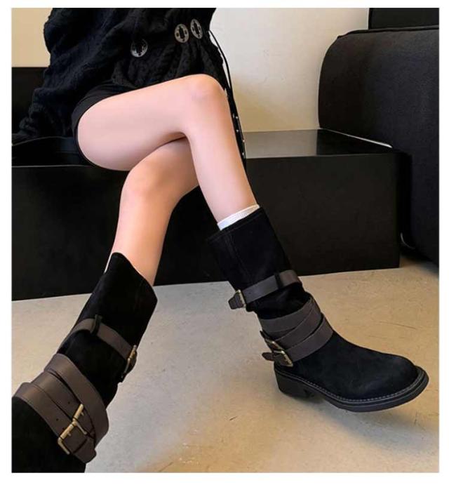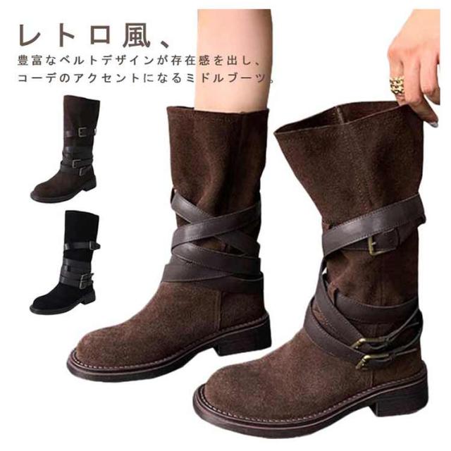 | レトロ風、豊富なベルトデザインが存在感を出し、 コーデのアクセントになるミドルブーツ。 履くだけでスマートな着こなしに! ショートパンツ/スカートなとボトムと好相性です。 | |