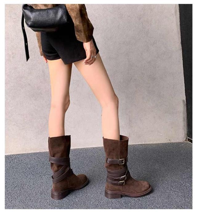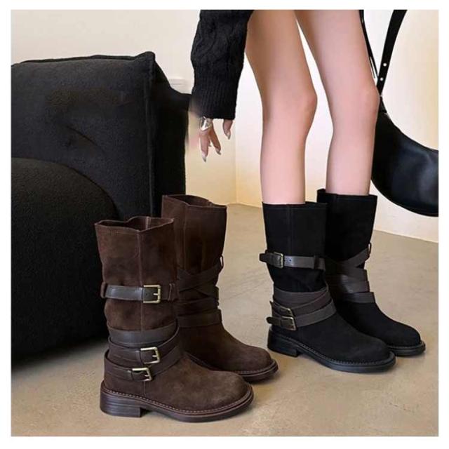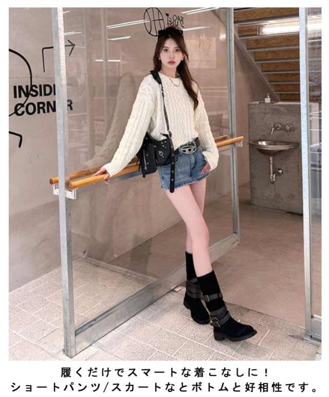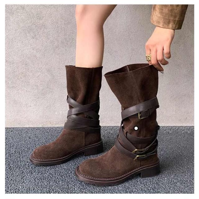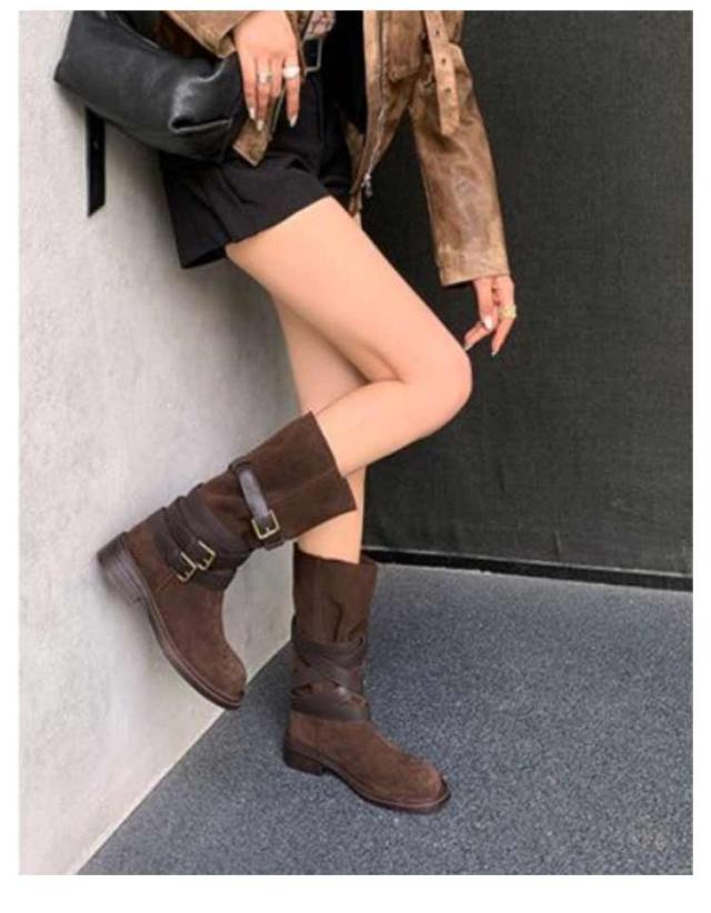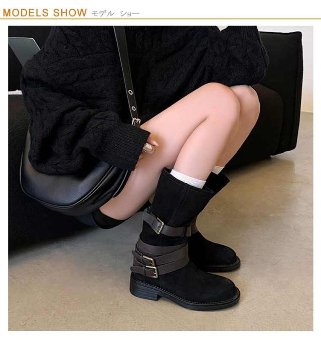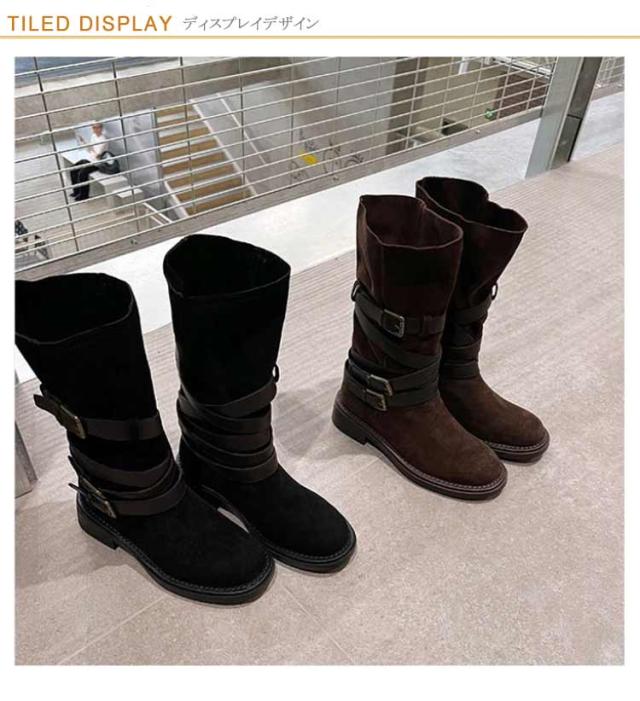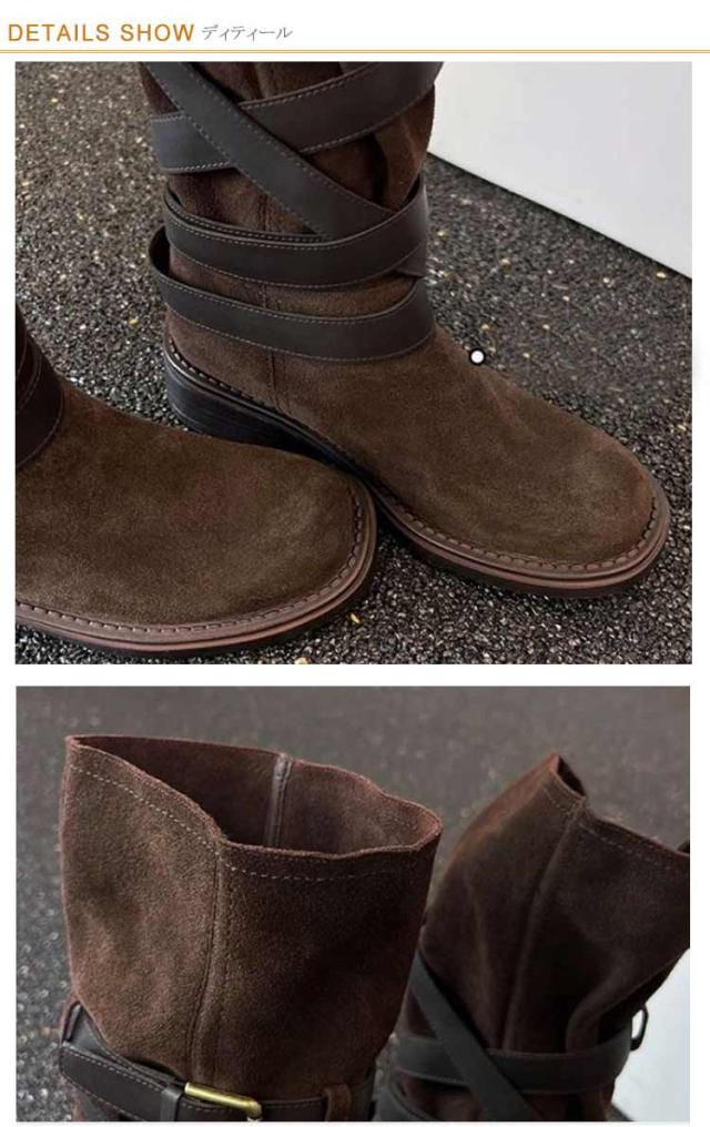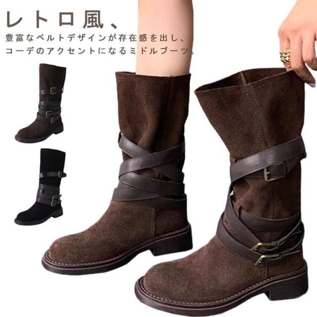 | レトロ風、豊富なベルトデザインが存在感を出し、 コーデのアクセントになるミドルブーツ。 履くだけでスマートな着こなしに! ショートパンツ/スカートなとボトムと好相性です。 | |