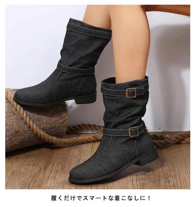 | レトロ風、豊富なベルトデザインが存在感を出しデニムブーツ。 コーデのアクセントになるミドルブーツ。 履くだけでスマートな着こなしに! ショートパンツ/スカートなとボトムと好相性です。 | |