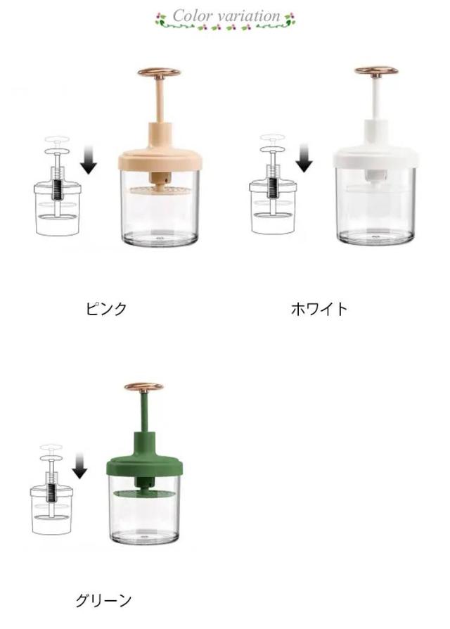 | とにかく泡立ちにこだわりたい方へお勧めの洗顔泡立て器。 使いやすくて、誰でも簡単に素早くふわふわの泡ができます♪ 豊かな泡を素早く作り、毛穴を深くきれいにするのに役立ちます。 シャンプー、や洗顔料はもちろん、固体の石鹸も適用します。 適量の水をボトルに注ぎ、ハンドルを上下に持ち上げ、濃い泡を作ります。 使用後のお手入れも簡単で、乾燥しやすくて衛生的です。 | |