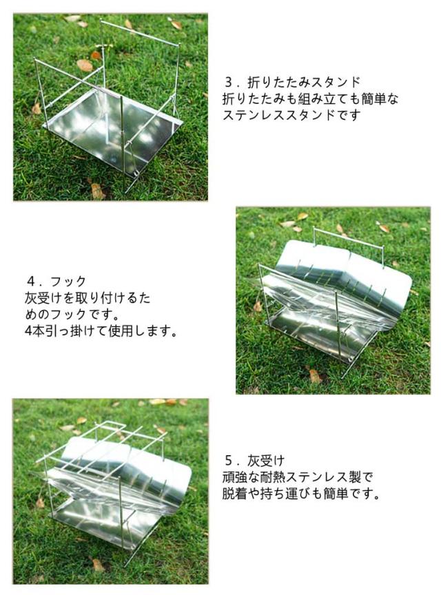 | 素材 | ロストル:304ステンレス スタンド:201ステンレス 灰受け:430ステンレス 焚き火シート:ガラス繊維 焚火シート収納ポーチ:オックスフォード+メッシュ |