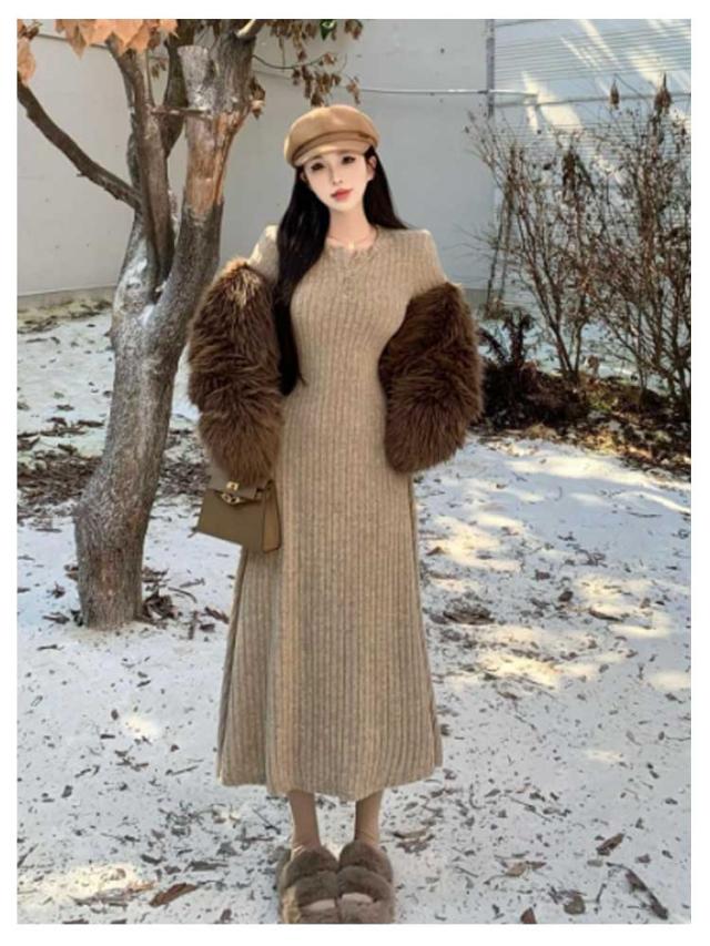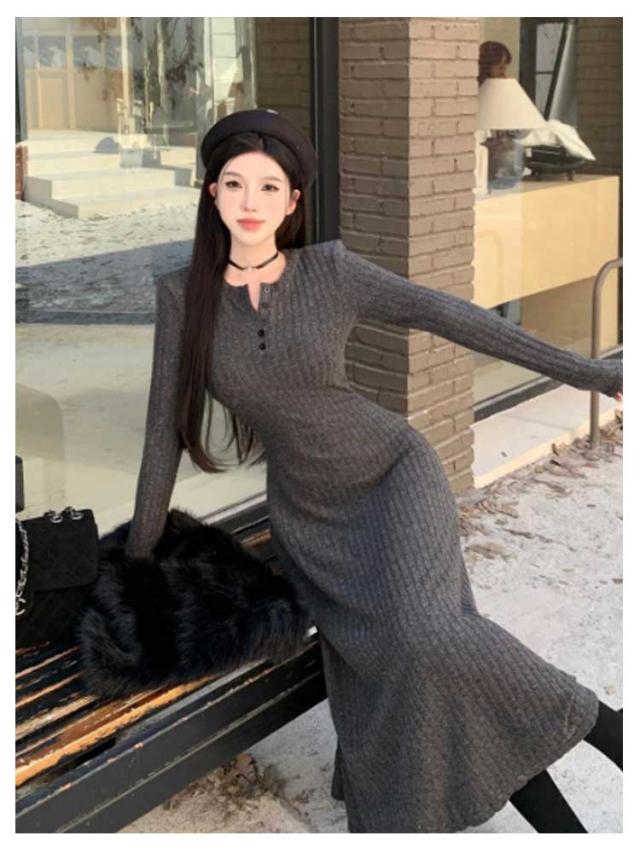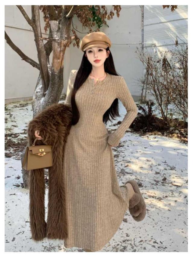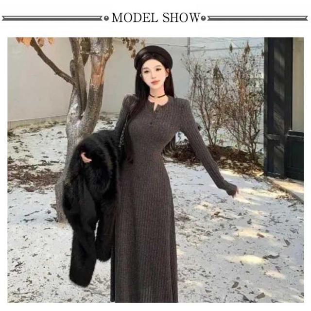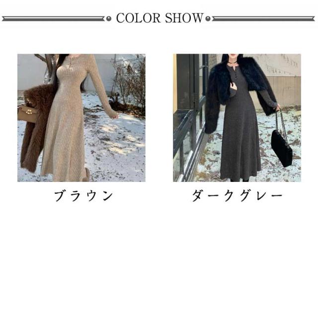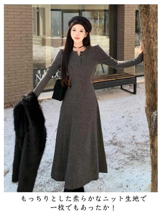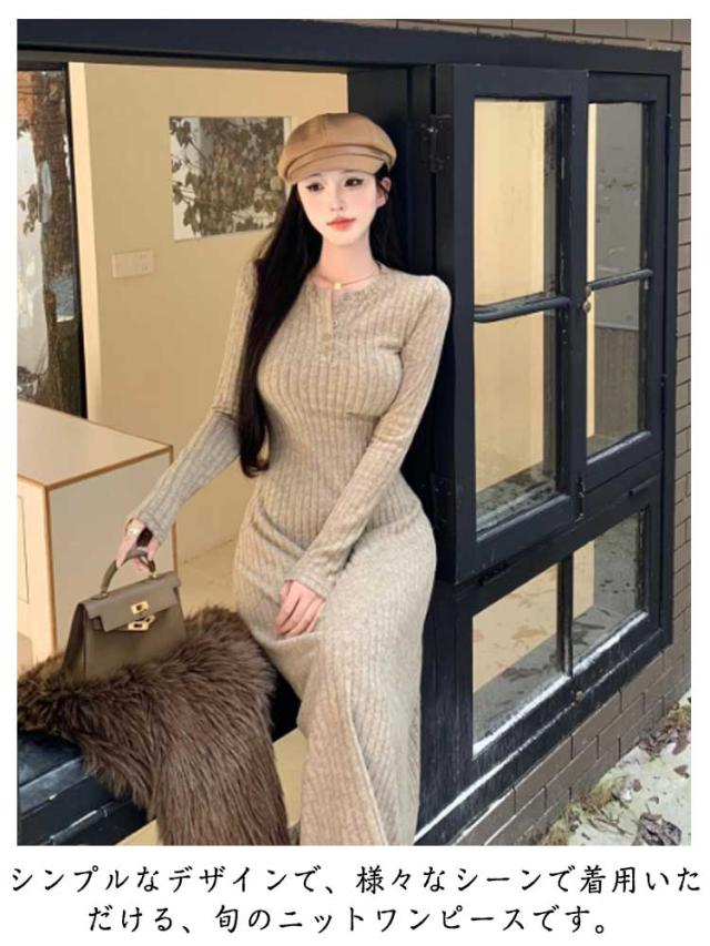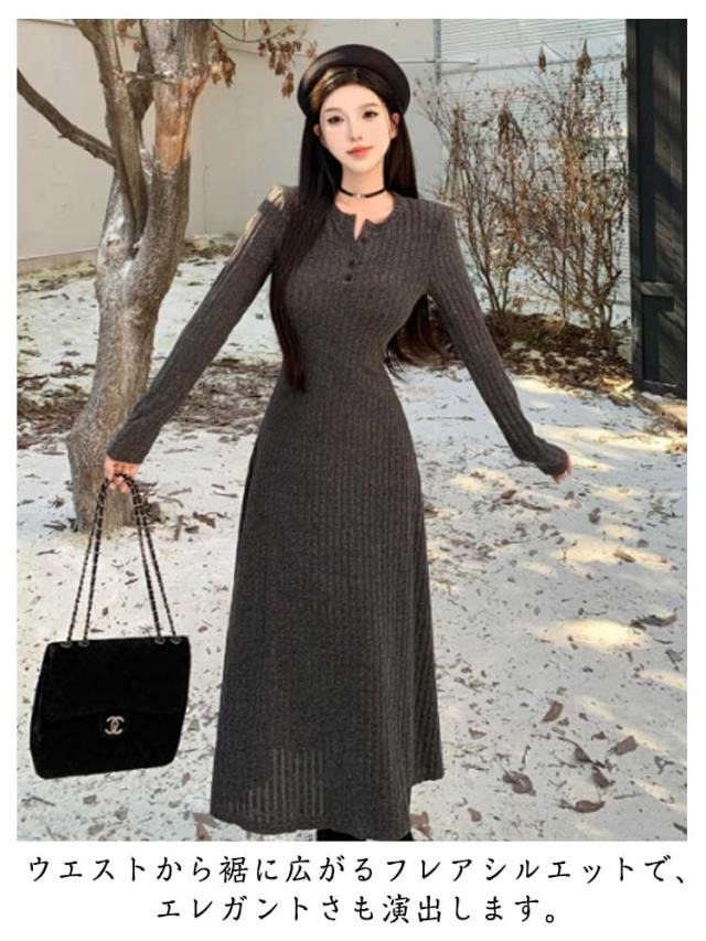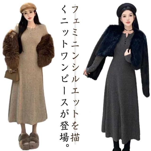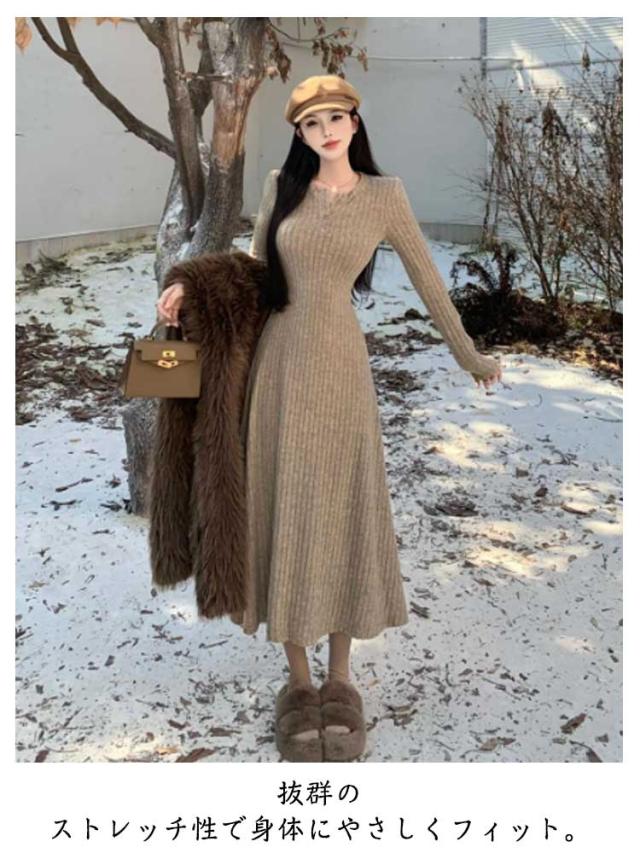 レディース フレア ニットワンピース ロングワンピース 体型カバー リブ ニットワンピ フェミニン タイトワンピース ニットワンピース フィット ロング丈 クルーネック きれいめ 無地 大人 ストレッチ 前開きボタン 秋 冬 秋服 冬服