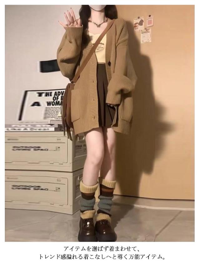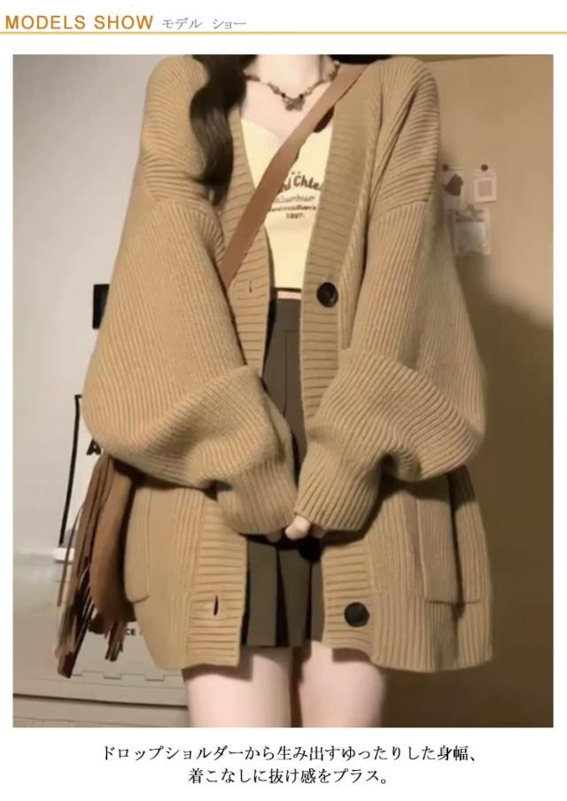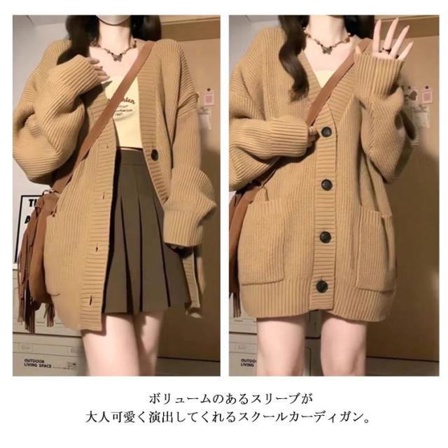 スクールカーディガン ロングカーディガン あぜ編み 大きいサイズ Vネック ドロップショルダー 秋冬 長袖 ニットカーディガン ボリューム袖 ゆるカーディガン ゆったり ビッグシルエット 体型カバー 華奢見せ セーター