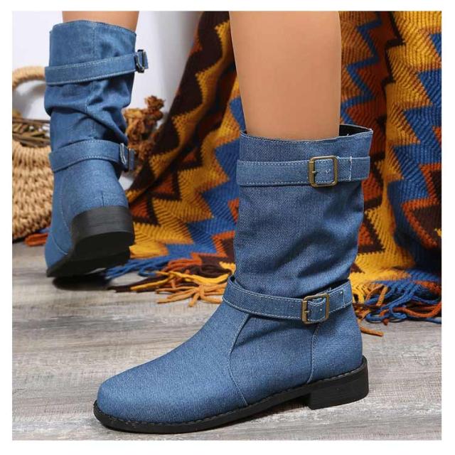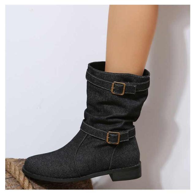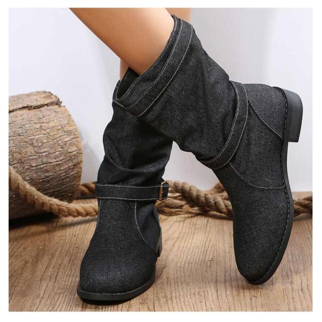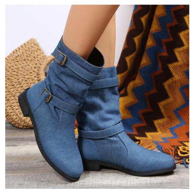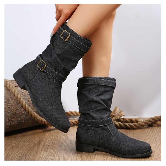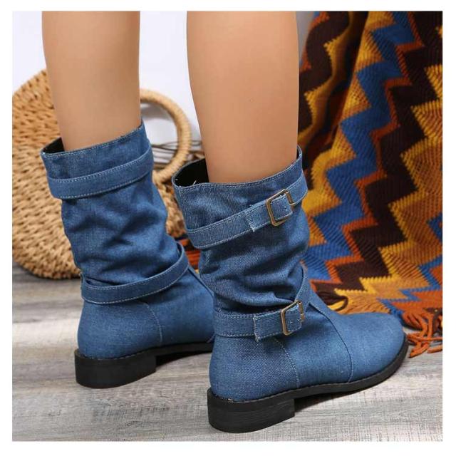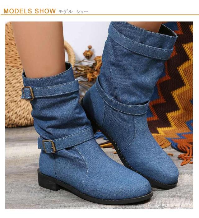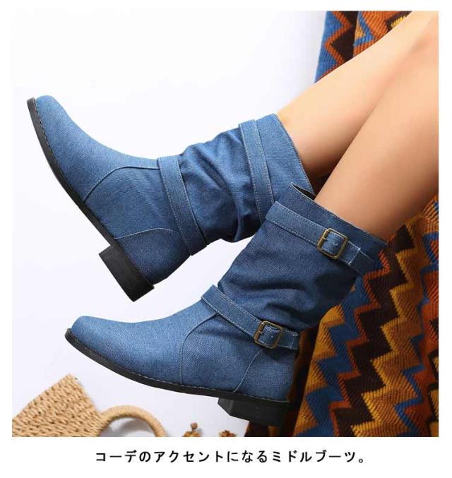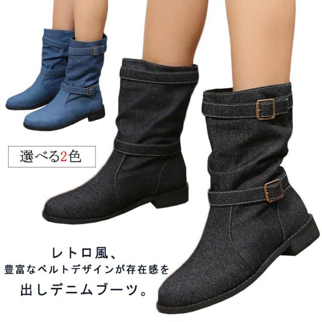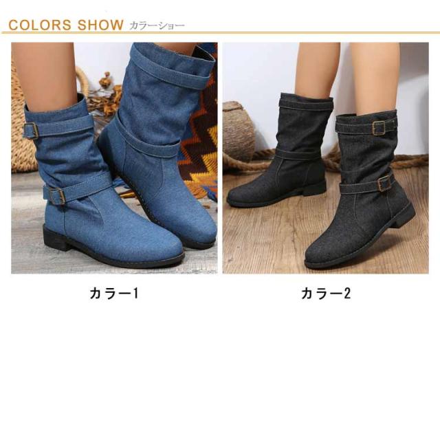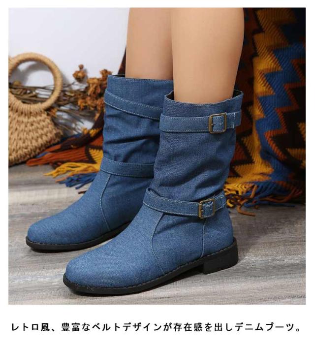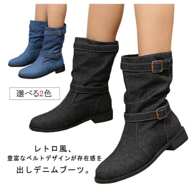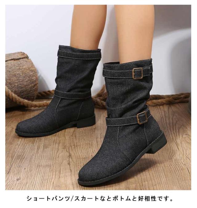| レトロ風、豊富なベルトデザインが存在感を出しデニムブーツ。 コーデのアクセントになるミドルブーツ。 履くだけでスマートな着こなしに! ショートパンツ/スカートなとボトムと好相性です。 | |