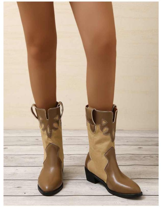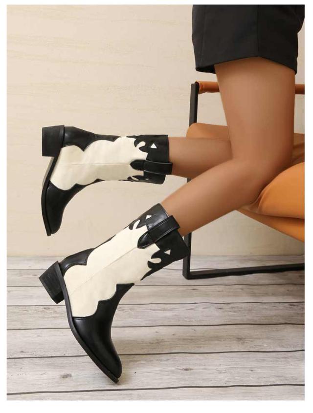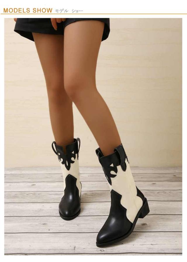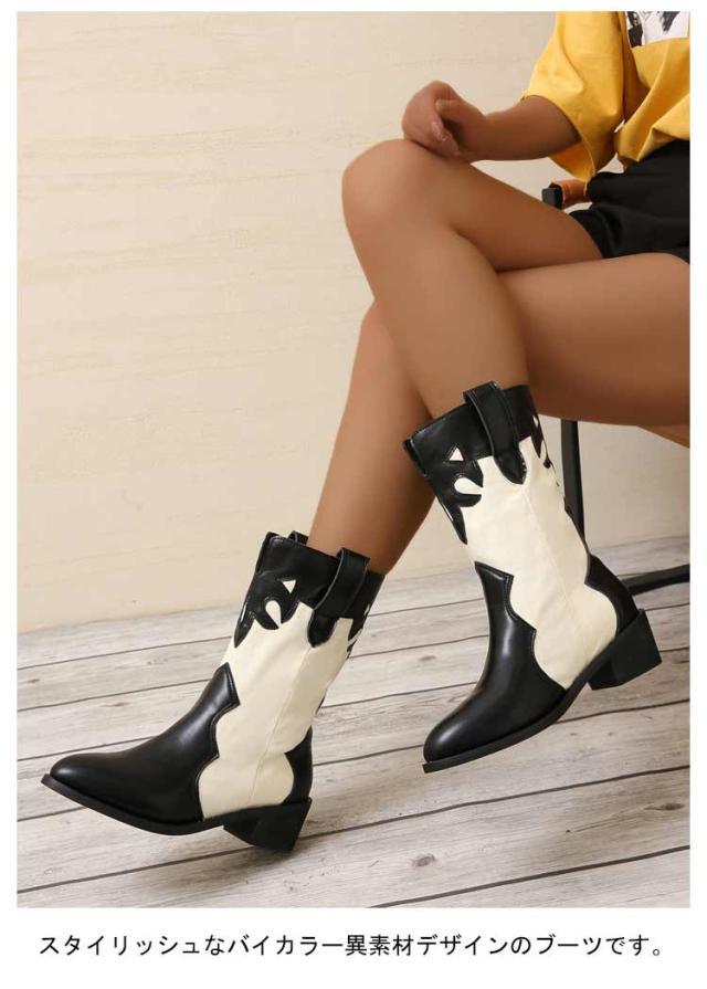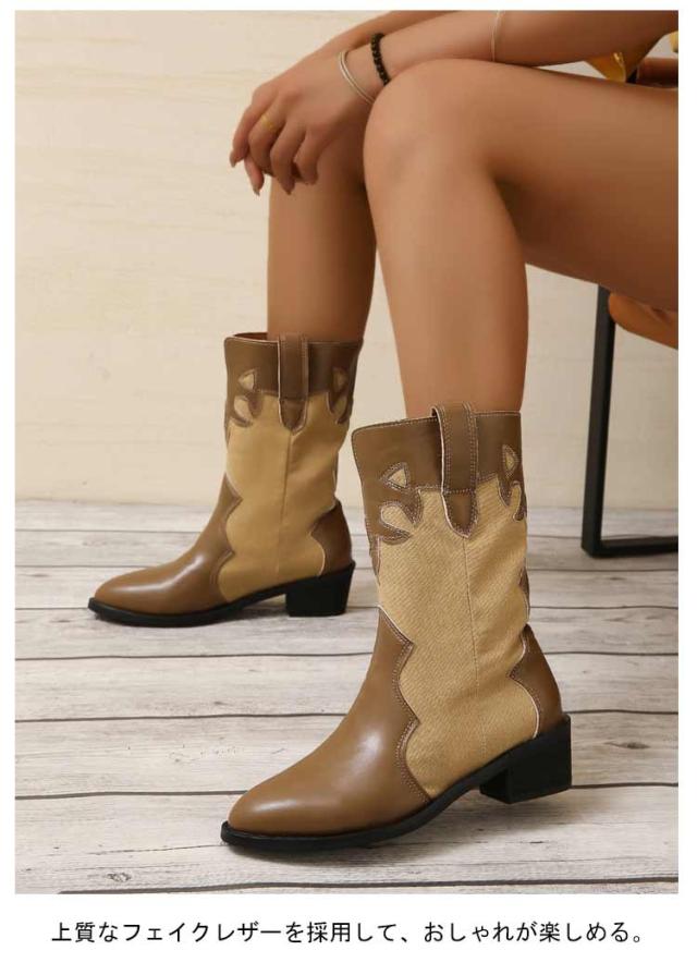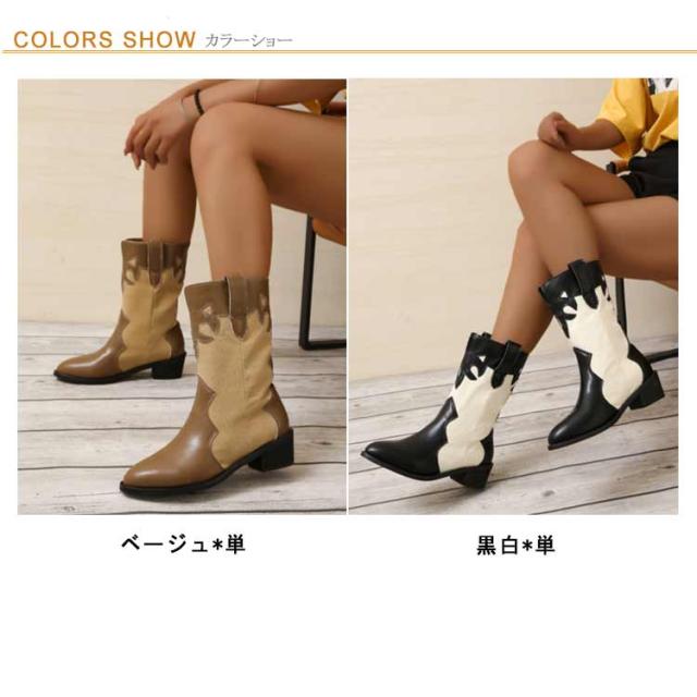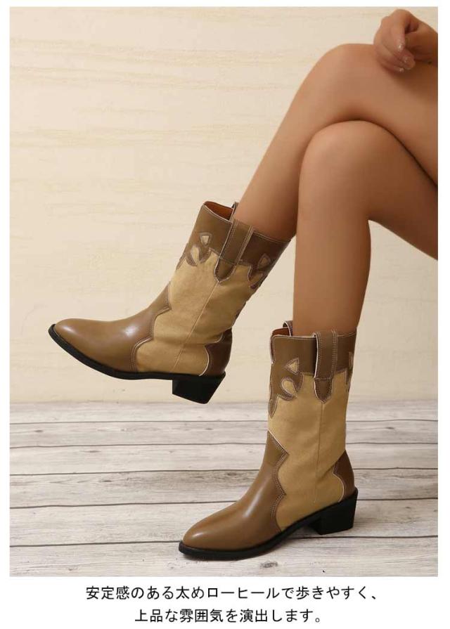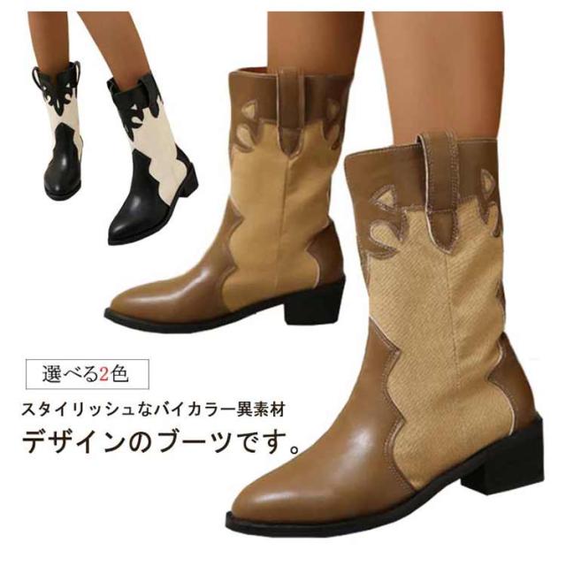 太めヒール ミドルブーツ レディース ウエスタンブーツ 歩きやすい レザー 靴 ポインテッドトゥ ブーツ 異素材切り替え バイカラー ローヒール 歩きやすい 痛くない 美脚ブーツ 大きいサイズ ブラック ベージュ