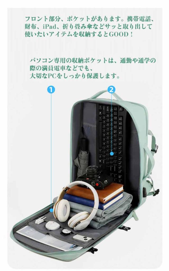 | 2WAY【リュック/手提げ】&USBポート付き、通勤や通学などのデイリーはもちろん、旅行/出張用のバッグとしてもオススメ! 小物とノートPCが入る大容量。書類や雑誌、折り畳み傘、ペットボトル、財布、衣類等普段持ち歩く荷物も楽に収納できます。 フロント部分、ポケットがあります。携帯電話、財布、iPad、折り畳み傘などサッと取り出して使いたいアイテムを収納するとGOOD! パソコン専用の収納ポケットは、通勤や通学の際の満員電車などでも、大切なPCをしっかり保護します。 高品質オックスフォード素材に撥水・防汚加工。水を弾くのに加え、汚れが付きにくいので、突然の雨やうっかりこぼしたコーヒーもサッと一拭きで元通り。 クッション性に優れた生地で肩や背中への負担を軽減。スーツケースに引っ掛けるキャリーオンベルトを搭載しており、出張、旅行での移動ストレスを解消! シンプルで無駄のない洗練されたデザインとカラーバリエーションが魅力! 年齢を問わず、普段使い、ビジネス、通勤、通学はもちろん旅行バッグとしてなどシーンを選ばずに使用できます。 | |