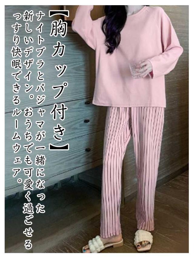 | 【ルームウエア上下2点SET】カップ付きトップス&ロングパンツのルームウェア上下2点セットです。 【胸カップ付き】ナイトブラとパジャマが一緒になった新しいデザイン。おうちでも可愛く過ごせるっすり快眠できるルームウェア。 【軽くてやさしい肌触り】生地は軽くやさしい肌触りでお家でのリラックスタイムを快適に過ごせます。ずっと着ていたくなるような気持ちよさです。別々でもコーディネートがしやすいので一年中着てもOK! 【ゆったりシルエット】ゆったりとしたシルエットにシンプルなデザインのパジャマは使い勝手◎ パンツのウエスト部分は総ゴムで着心地抜群。 | |
