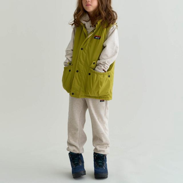 ウエストには大きめサイズのパッチポケットがあり、子供が必要な小物をしっかり収納できます。アームホールには柔らかなストレッチテープのバインディング処理が施されており、動きやすさとフィット感を向上。