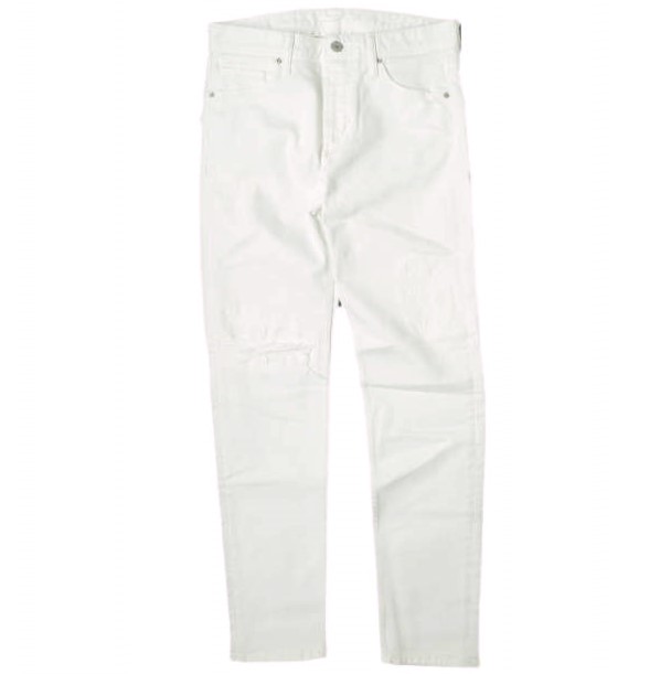 クリーンなホワイトジーンズをベースに、ダメージやリペア加工が施された逸品。