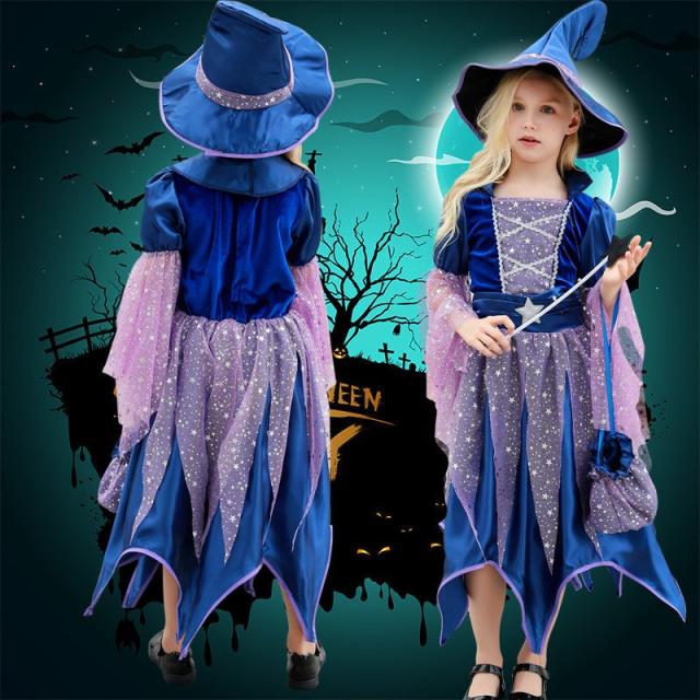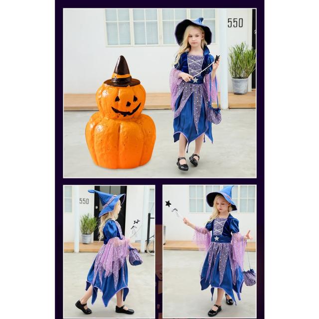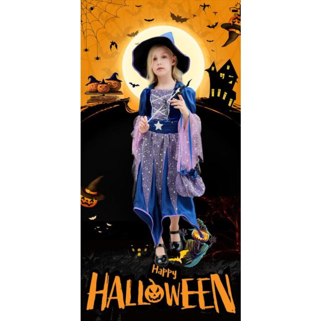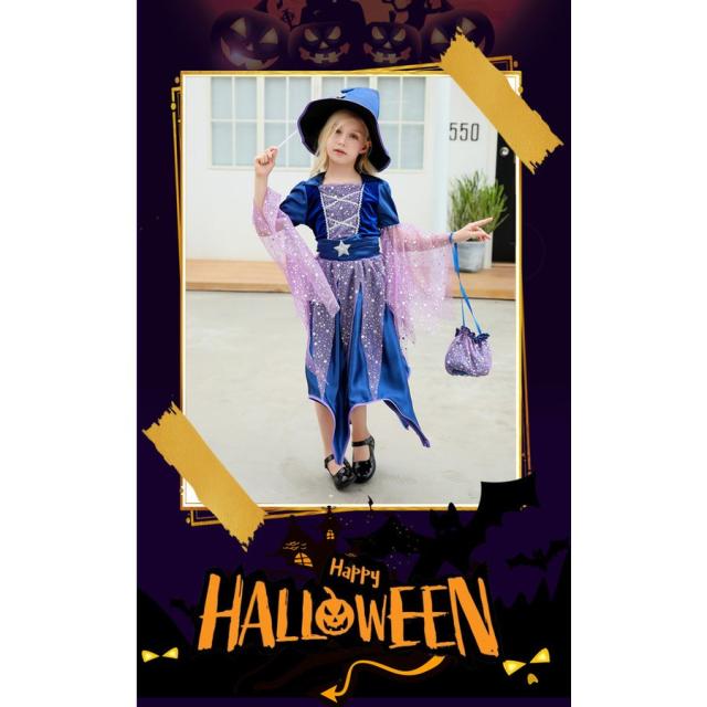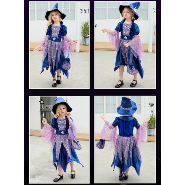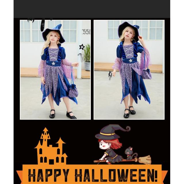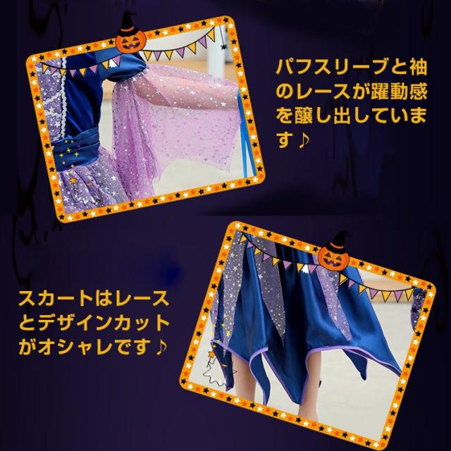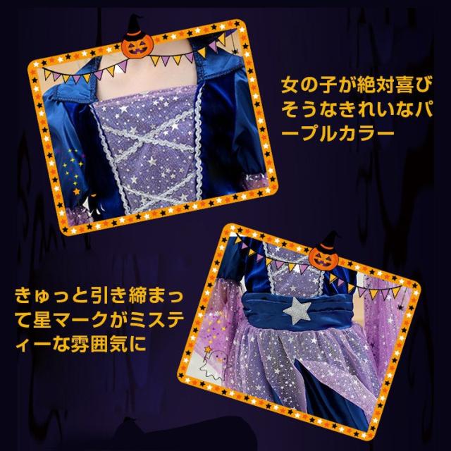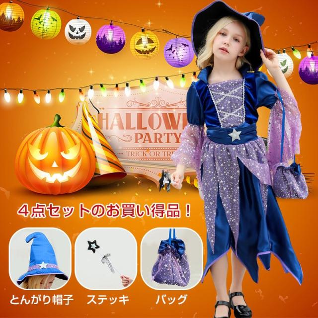 ハロウィン仮装 魔女 コスプレ衣装 キッズ用 ワンピース 帽子 ステッキ バッグ 4点セット 子供 女の子 ドレス 魔法使い かわいい コスチューム クリスマス