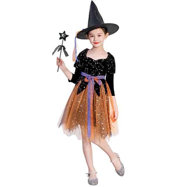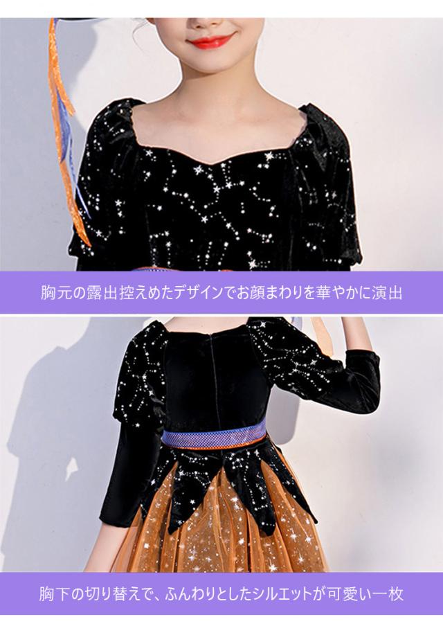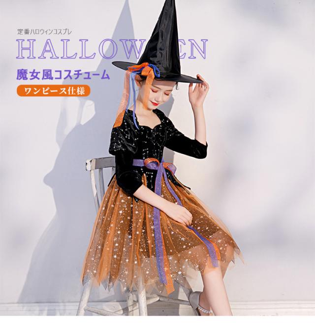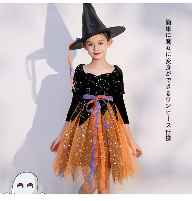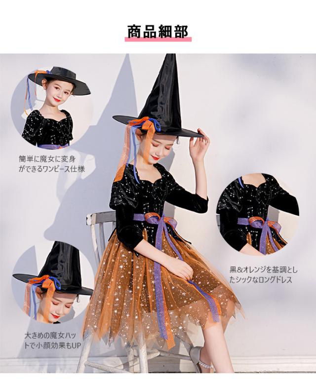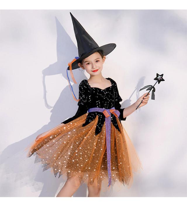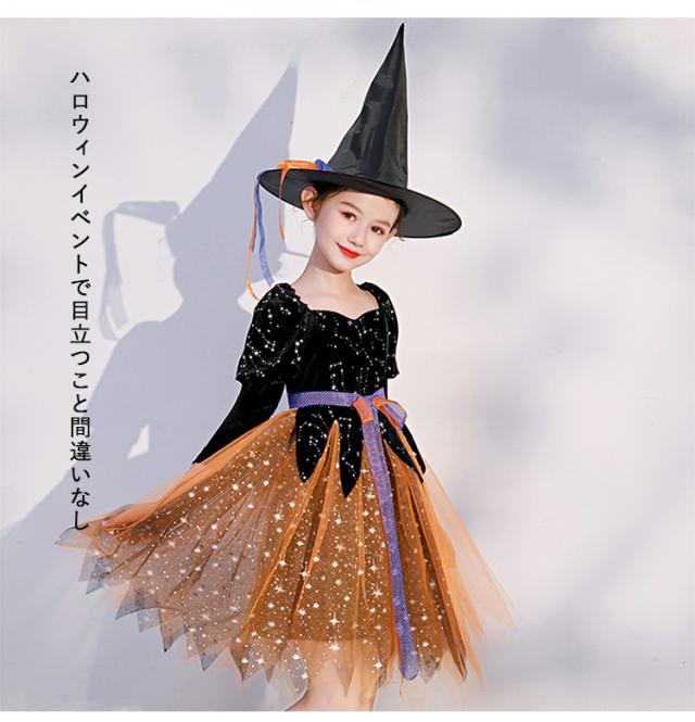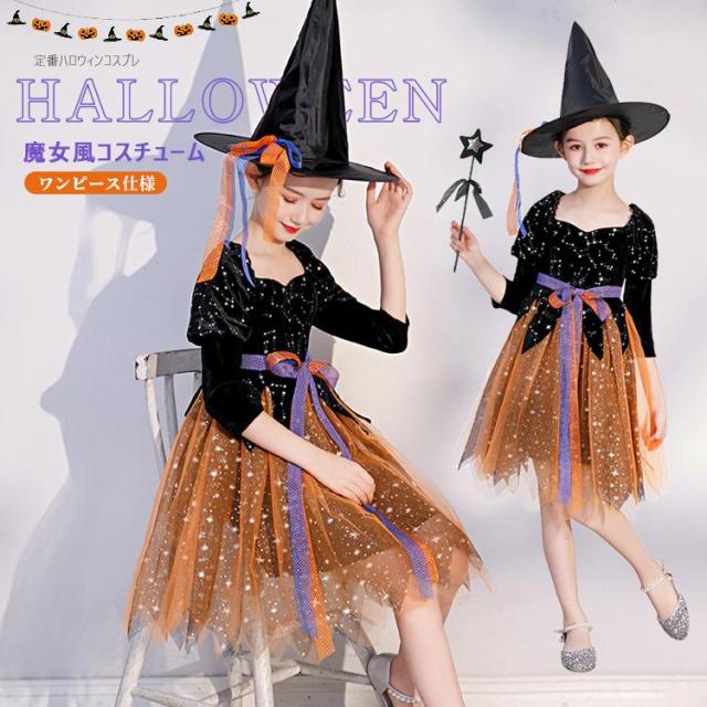 ハロウィン ワンピース 衣装 仮装 可愛い 帽子/杖付き ドレス キッズ ウィッチ 魔女っ娘 Halloween Cosplay 女の子 子供 魔女 仮装 女子 キラキラ リボン 可愛い 長袖 帽子付き オレンジ ウィッチ パーティー 誕生日 発表会 クリスマス 魔法使い 魔法の杖