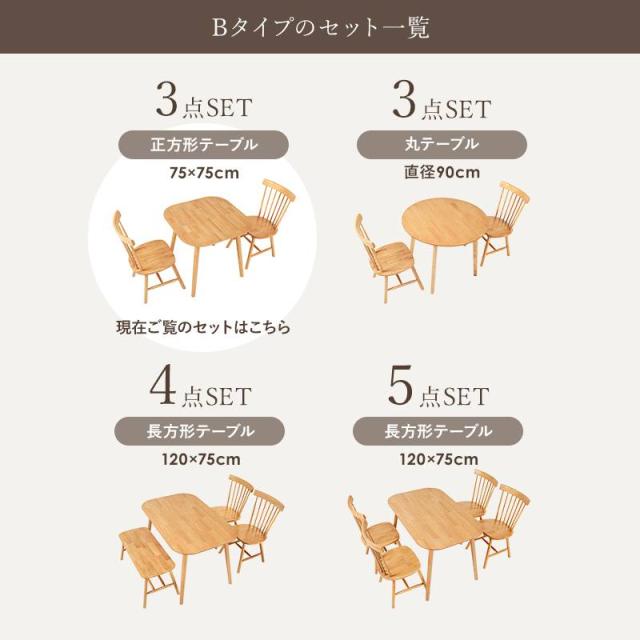 ダイニング3点セット テーブル チェア2脚 3点セット 正方形 75×75 ダイニングテーブルセット 天然木 ウィンザーチェア 北欧 2人掛 新生活