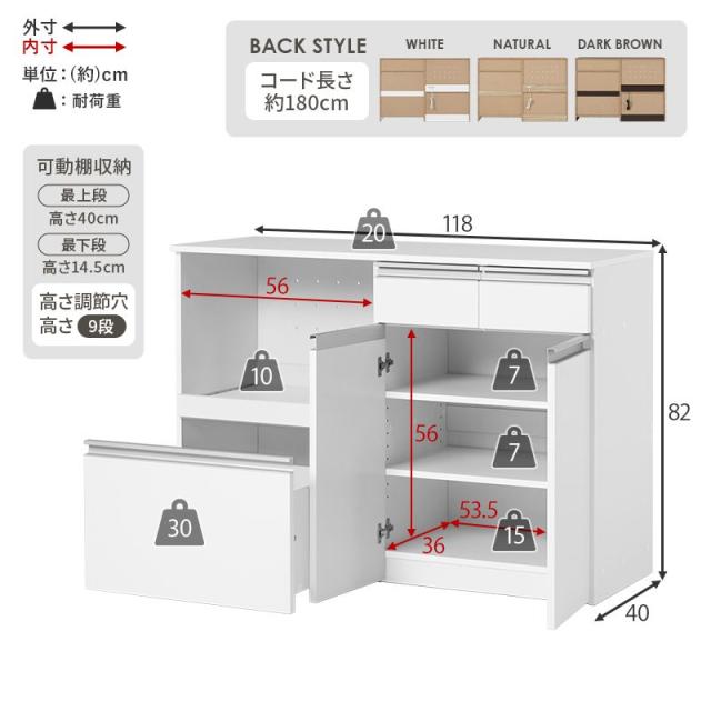 キッチンカウンター(収納庫タイプ)幅118 カウンターテーブル キッチン カウンター キッチン収納 食器棚 キッチンラック キッチン家電収納 キャビネット オープン棚 扉付き スリム 隙間 サイドワゴン 作業台 おしゃれ 食器 引き出し VKC-7155
