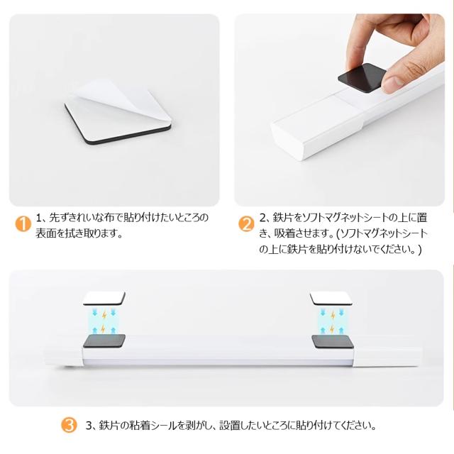 方法二:鉄片をソフトマグネットシートの上に置き、吸着させます。(ソフトマグネットシートの上に鉄片を貼り付けないでください。)鉄片の粘着シールを剥がし、設置したいところに貼り付けます。マグネットとライト本体は分離可能。