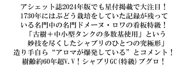 アシェット誌2024年版でも星付掲載で大注目! 1730年にはぶどう栽培をしていた記録が残って いる名門中の名門ドメーヌ・ロワの看板特級! 「古樹+中小型タンクの多数基使用」という 妙技を尽くしたシャブリのひとつの究極形」 造り手自ら“アロマが爆発している”とコメント! 樹齢約60年超V.V!シャブリGC(特級)ブグロ!