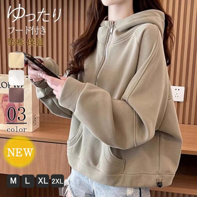 パーカー レディース アウター フード付き ゆったり ジップパーカー プルオーバー ライトアウター 羽織り 無地 防寒 保温 暖か
