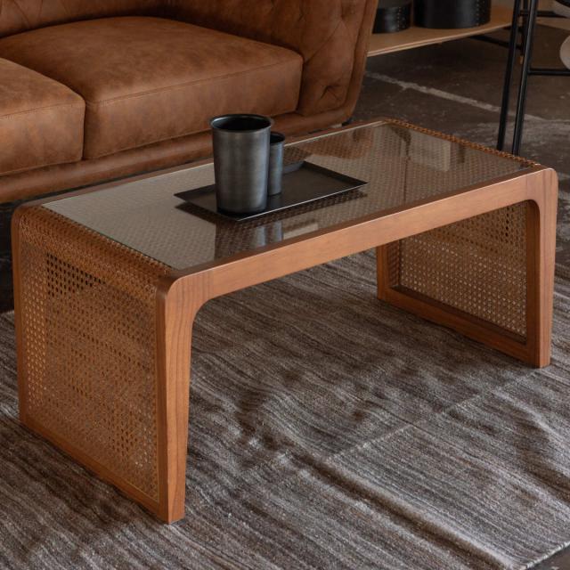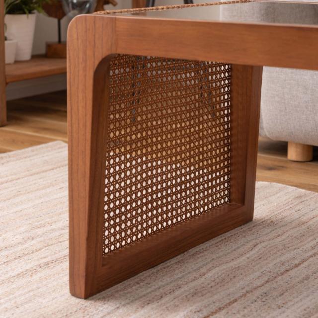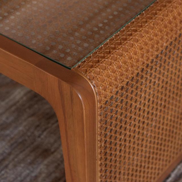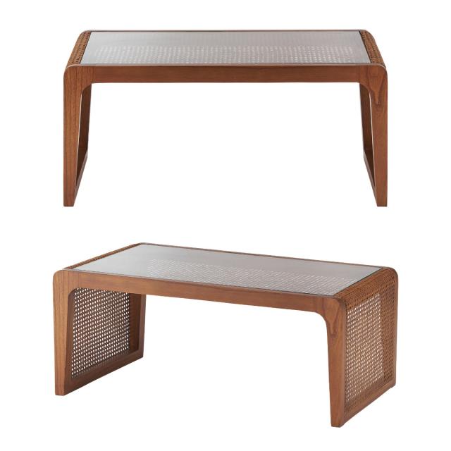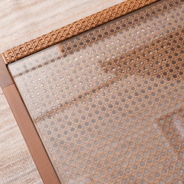 天板にはラタン素材とガラスを使用し、脚部には温かみのある天然木ミンディ材を組み合わせています。異素材のデザインで、ワンランク上のこなれた雰囲気を演出します。ハンドメイド商品のため、一つ一つの個性としてお楽しみください。