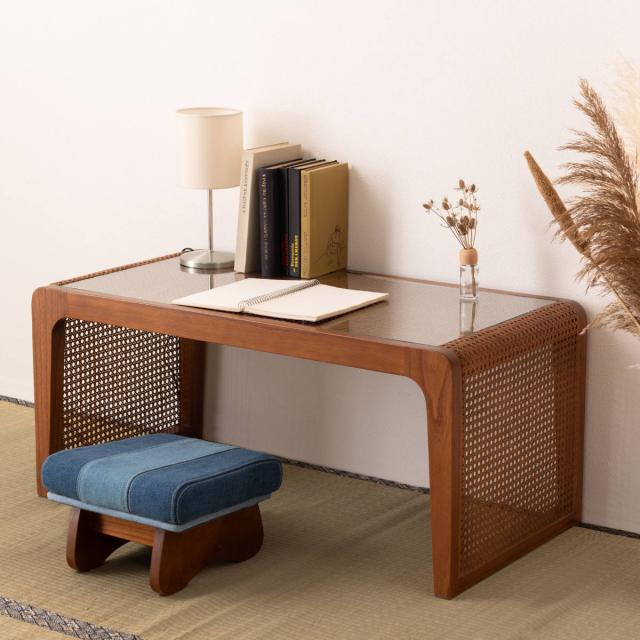 天板に繊細なラタン素材と5mm強化ガラスを使用したテーブルです。かごめ編みのラタンがガラスから透き通って見えることで、爽やかで抜け感のある仕上がりになっております。和風なお部屋にもぴったりなデザインです。