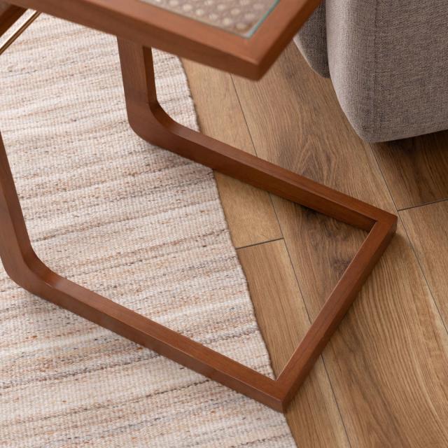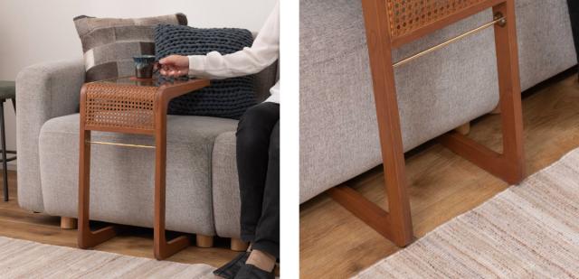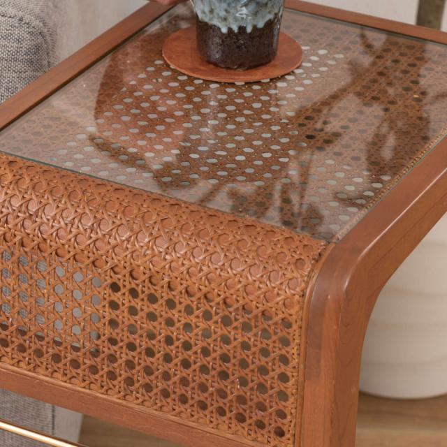 天板にはラタン素材とガラスを使用し、脚部には温かみのある天然木ミンディ材を組み合わせています。異素材のデザインで、ワンランク上のこなれた雰囲気を演出します。ハンドメイド商品のため、一つ一つの個性としてお楽しみください。